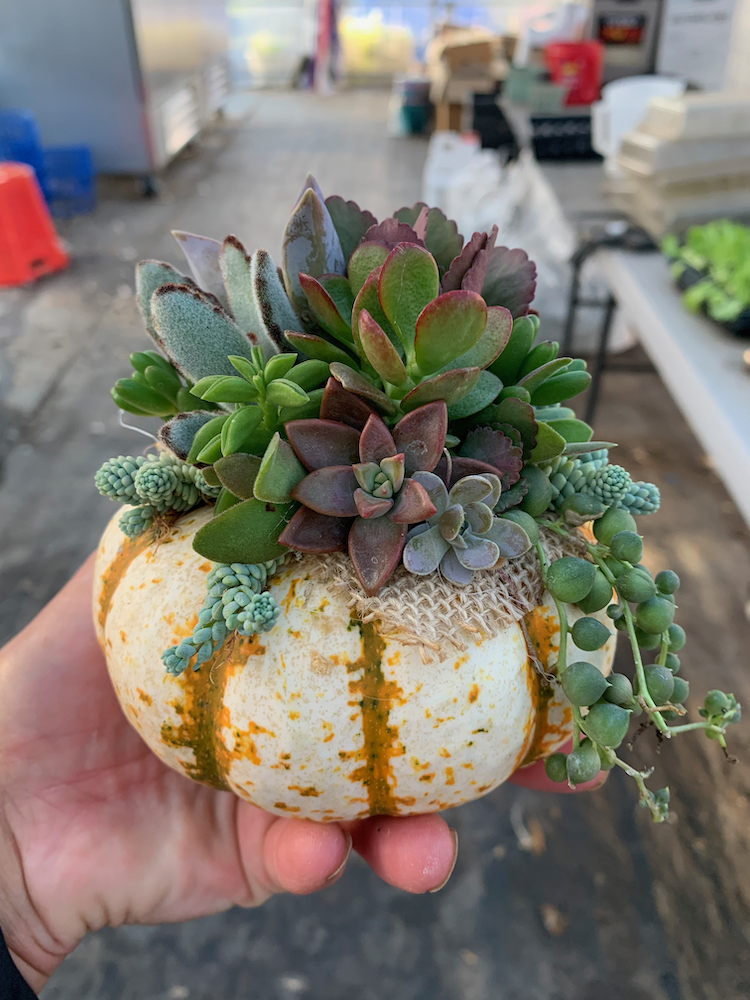 Assortment of succulents in a fall gourd.