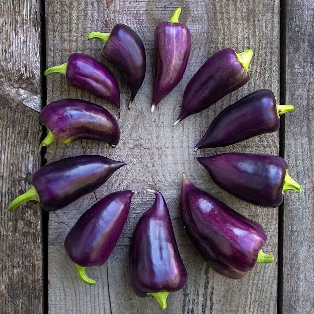 Huge yields of easy-to-grow, sweet violet fruit! Pointed, wedge-shaped fruit is purple streaked with pale yellow. Ripens red. Very lovely and delicious, sweet, crisp and thick-walled.